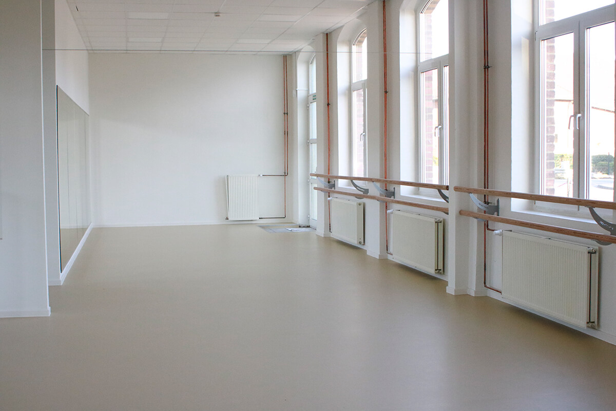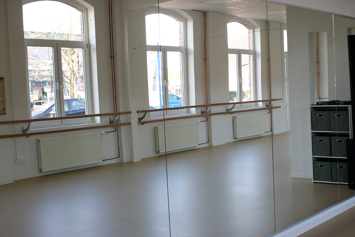 Unsere wunderbaren Räumlichkeiten in der Fritz-Erler-Str. 42 im Dürener Zentrum bieten einen großen, quadratischen Ballettsaal mit 140 Quadratmetern und Klavier sowie einen kleineren Saal mit 85 Quadratmetern. Dank der Förderung der Beauftragten der Bundesregierung für Kultur und Medien im Programm NEUSTART KULTUR und des Hilfsprogramm DIS-TANZEN des Dachverbandes Tanz Deutschland sind beide Räume mit professionellen Schwingböden, Tanzteppichen, Wandspiegeln, Stangen sowie modernen Musikanlagen ausgestattet.